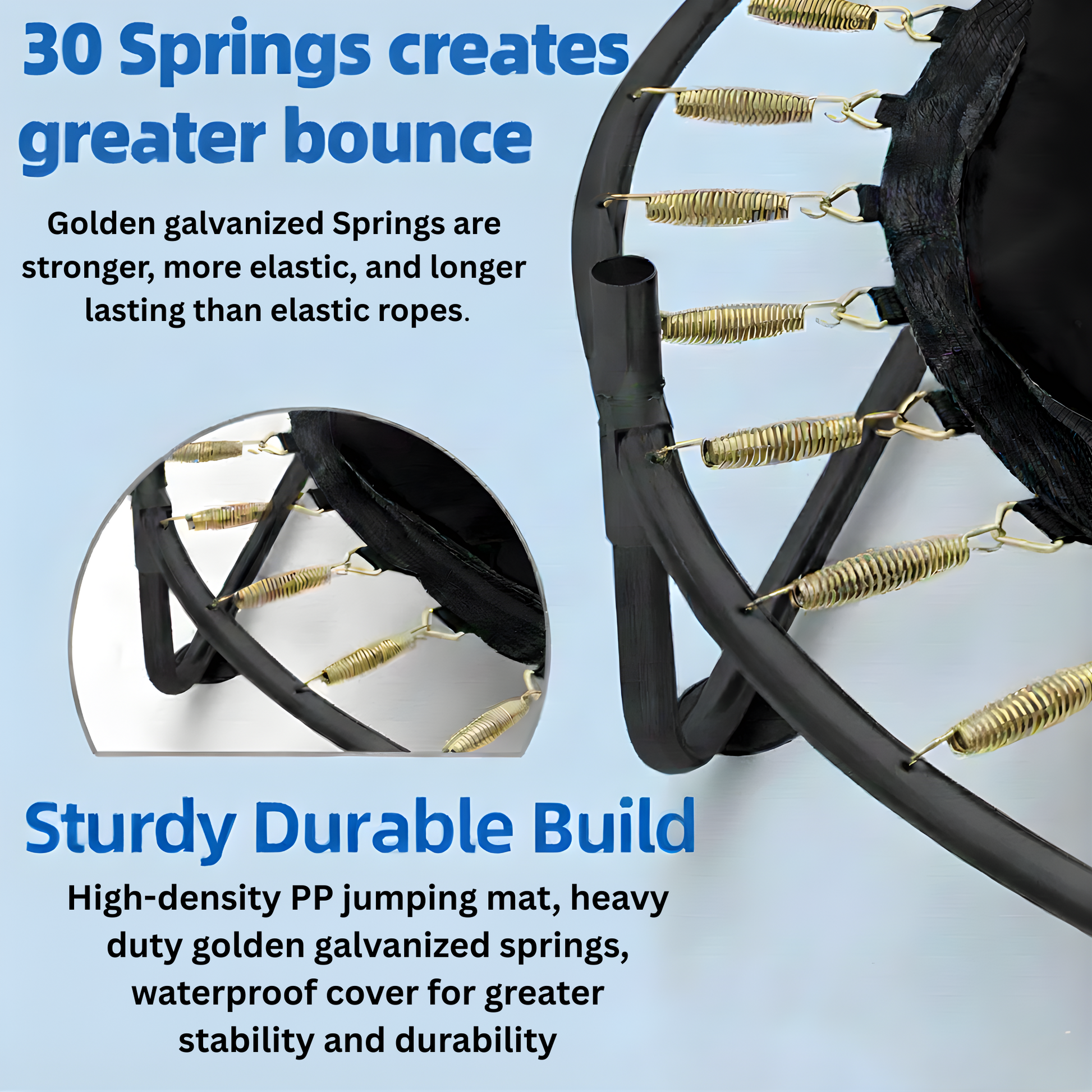 • 30 heavy-duty golden galvanized springs – We use professional-grade metal springs designed for consistent bounce and long-term performance, while other brands rely on inferior elastic ropes that lose tension and bearing capacity over time.